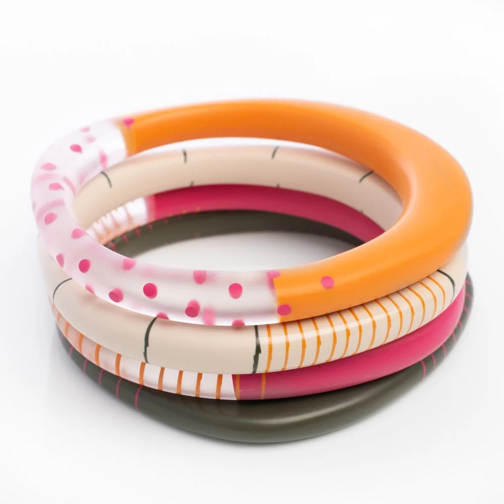 Kaz, working mainly in resin, produces pieces by combining a bold colour palette with pattern. Magnetic, reversible and mismatch are all strong elements of Kaz's designs.